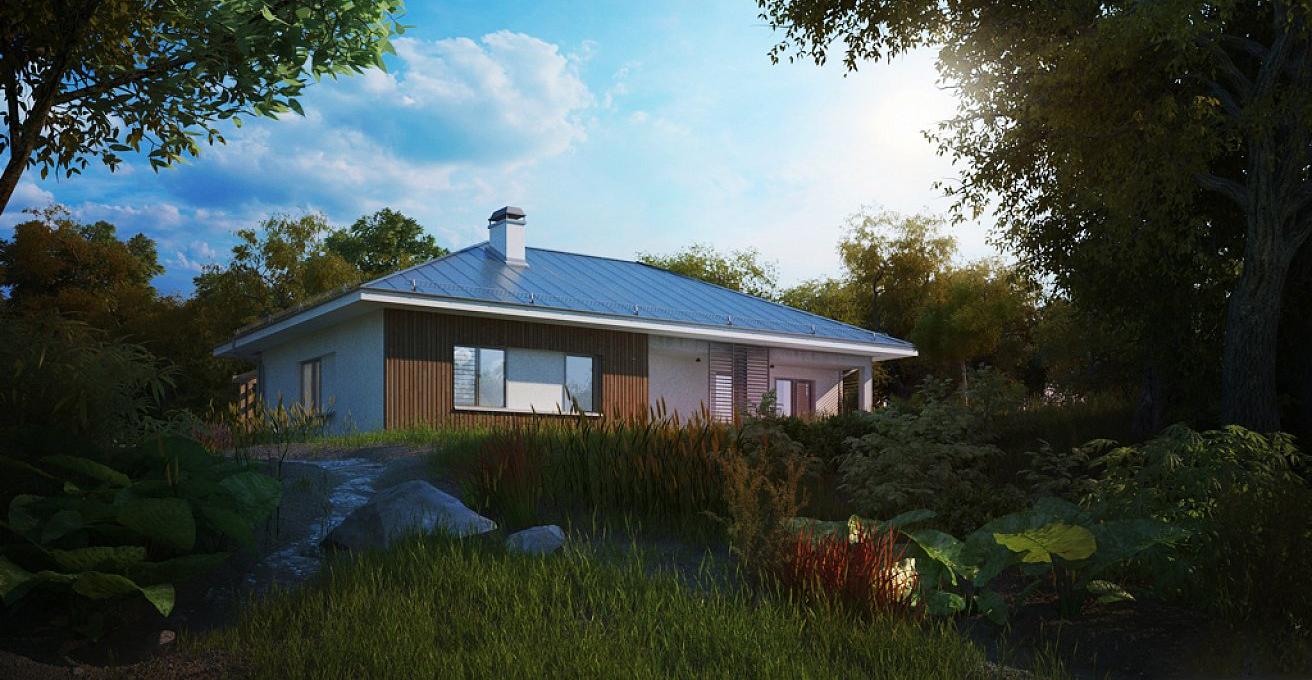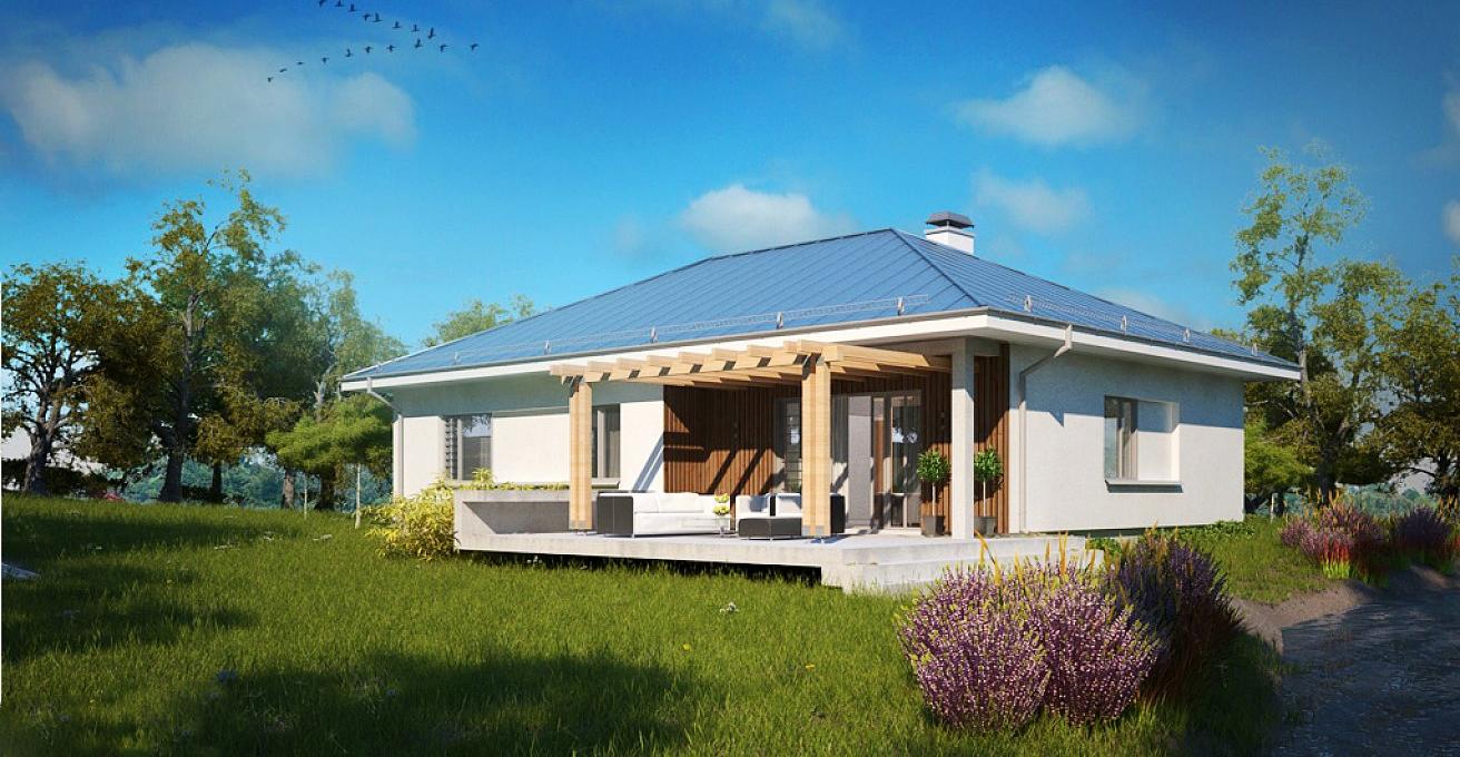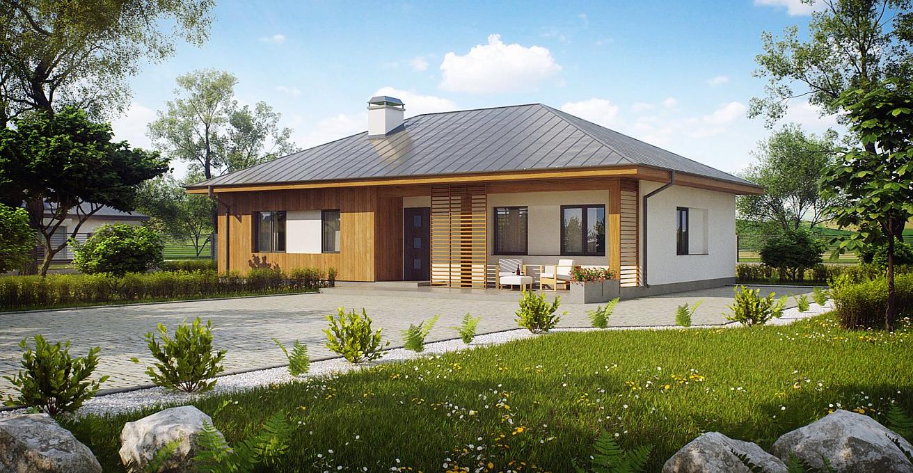 Функциональный одноэтажный дом с тремя спальнями и многоскатной крышей.
