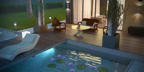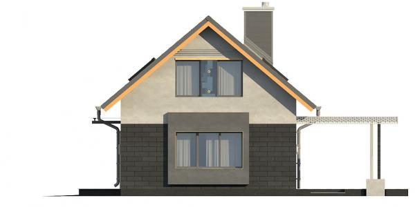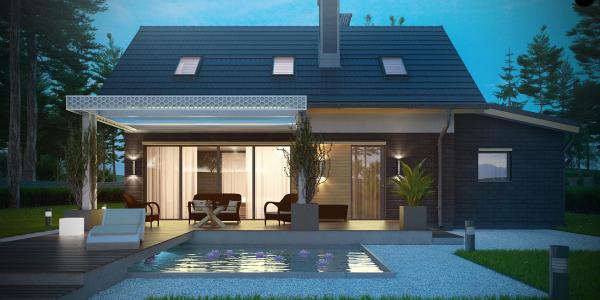 - Конструкция террасы предусматривает её затенение с помощью временного навеса, который удачно защитит от зноя в летнюю жару, и возможность демонтажа навеса в холодный период для исключения затенения гостиной. Тамбур, соединяющий гараж с домом, не только убережет дом от попадания неприятных запахов от автомобиля, но и станет прекрасным местом хранения подсобного инвентаря.