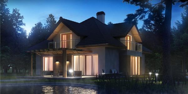 Разработка представляет версию проекта с альтернативной планировкой мансардного этажа. Именно мансарда является главным украшением экстерьера. В данном проекте вместо двух ванных комнат на втором уровне спроектирована одна общая. Кроме того, в новой разработке увеличено количество спален до четырёх, при этом у трёх комнат предусмотрены собственные балконы. Также несколько возросла площадь общего холла (теперь он занимает 9 кв.м). На первом этаже планировка оставлена прежней — здесь спроектирована дневная зона открытого типа. В дальней части выделено место для дополнительной комнаты.