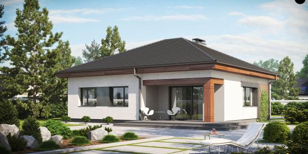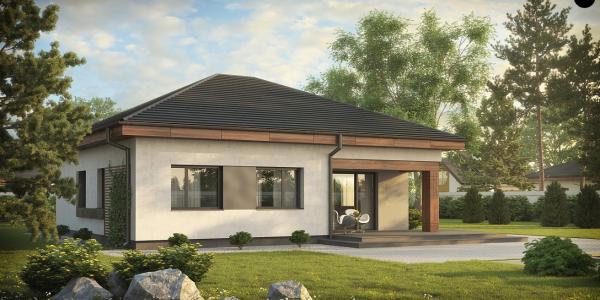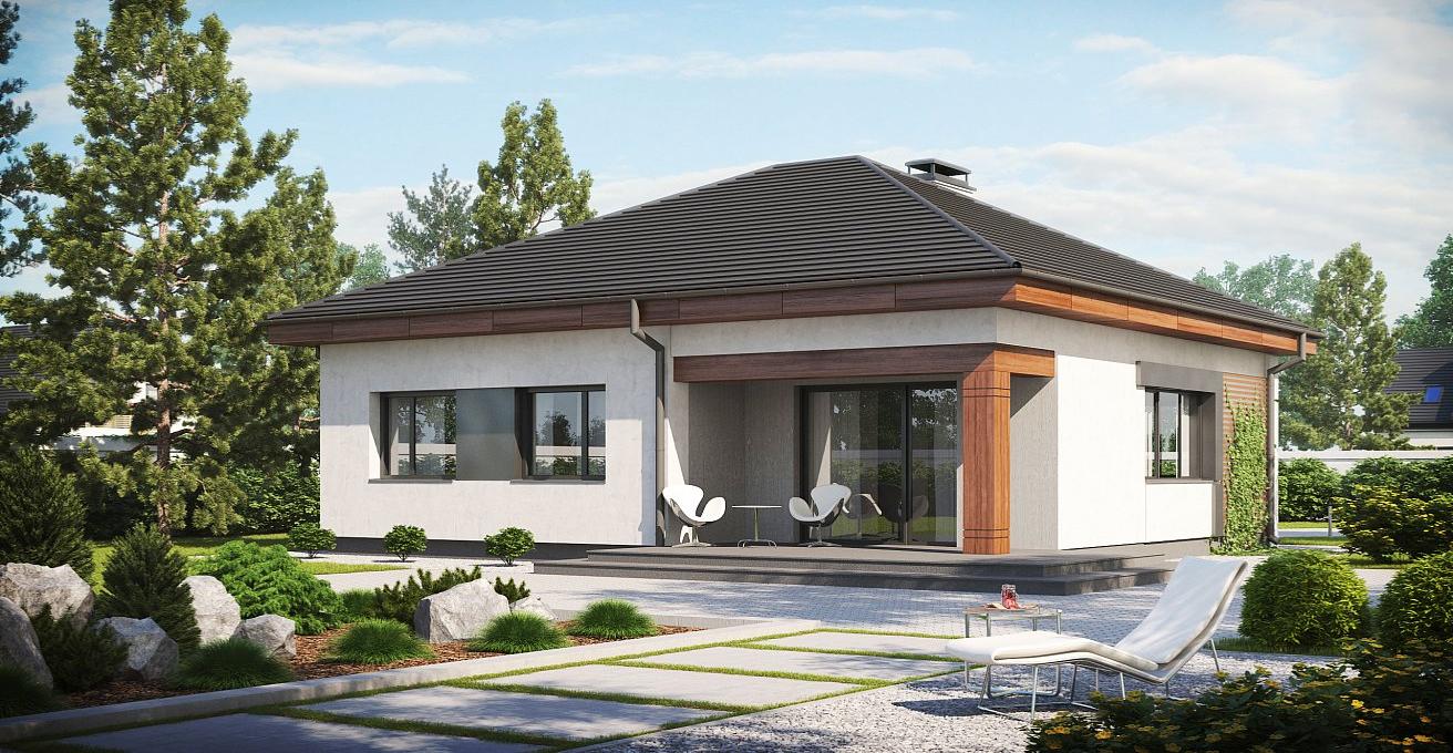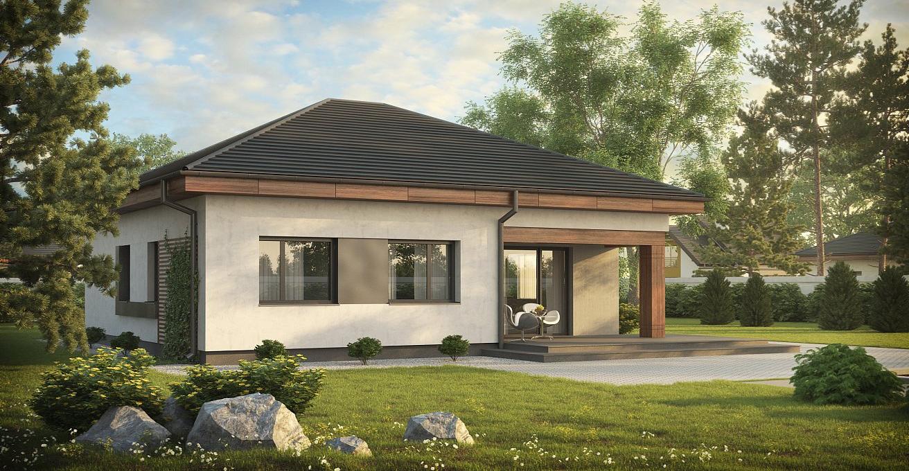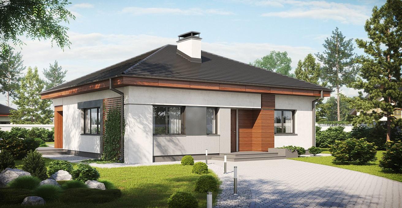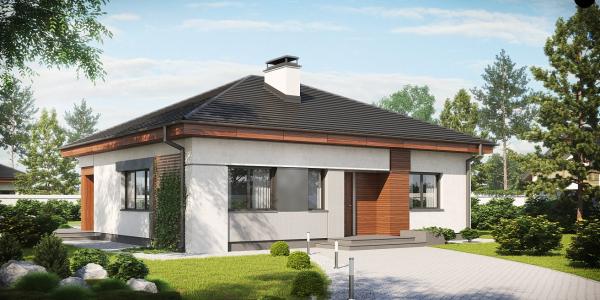 Это одноэтажный дом в классическом стиле с прекрасной отделкой из дерева и черепицы на кровле.