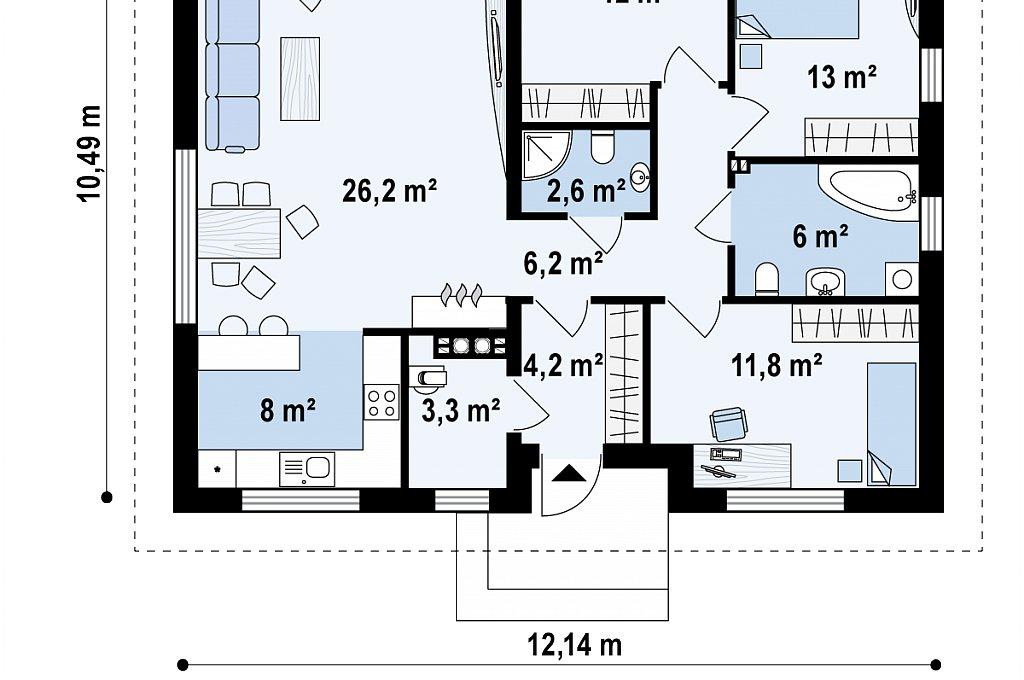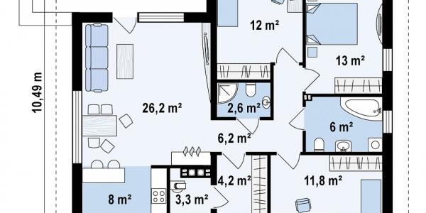 - Зона отдыха представлена тремя спальнями и двумя санузлами. Удобство маленькой комнаты заключается в возможности её переоборудования в подсобное помещение, гардероб. Кроме этого, внутреннее пространство дома можно переделать на свое усмотрение, а расходы на строительство снизит устройство единого дымового канала.