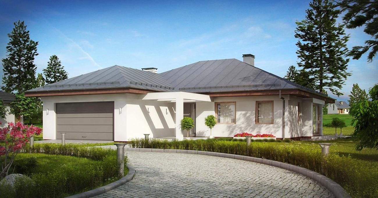 Одноэтажный дом в классическом стиле с функциональной планировкой комнат и гаражом.