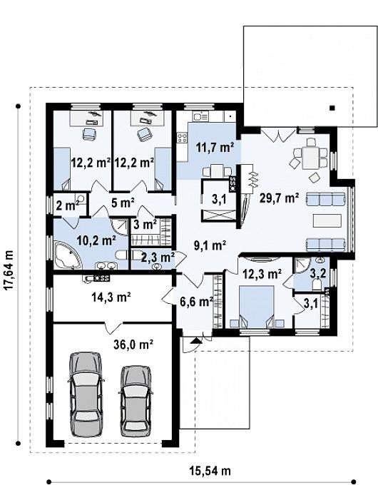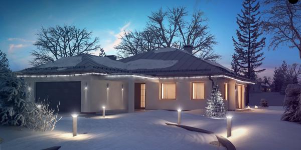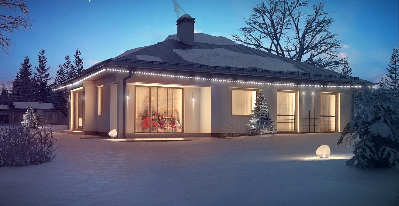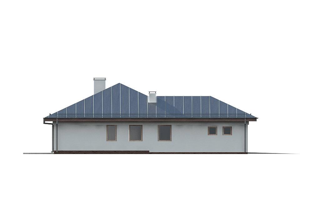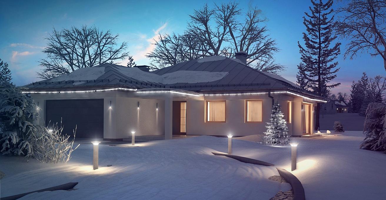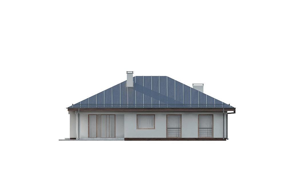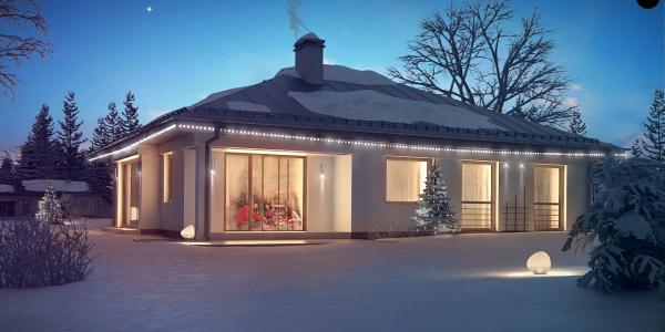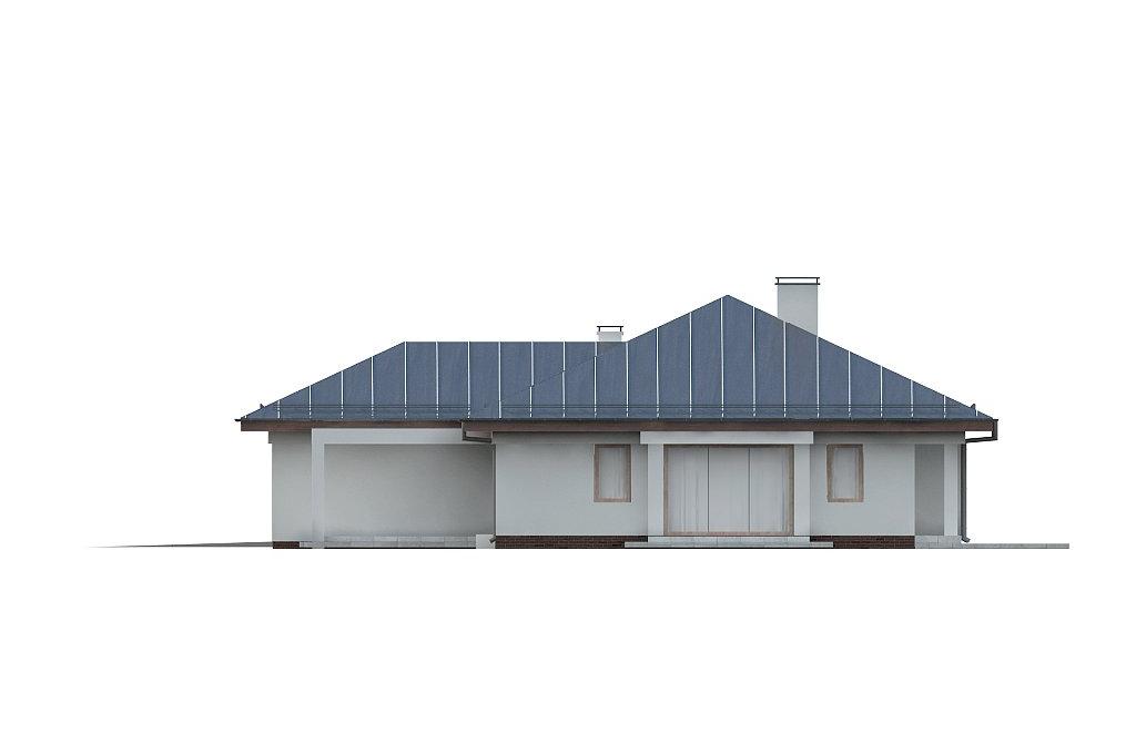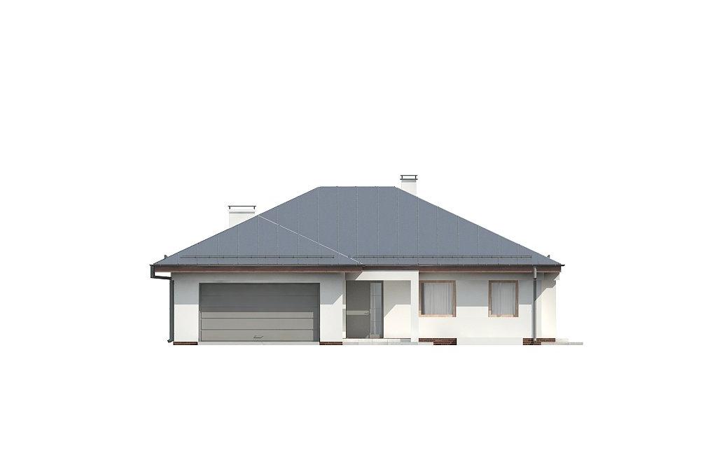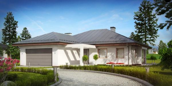 Это одноэтажный дом с гаражом. Стиль дома — это классическая архитектура в современной интерпретации. Приглушенные цвета фасадов делают дом элегантным и уютным одновременно. Дневная часть — это прежде всего очень просторная гостиная с эркером, который позволяет любоваться красиво оформленным садом. Благодаря небольшому санузлу, доступному из холла, гости не будут заходить в другие зоны дома. Просторная кухня имеет свою функциональную кладовую. Дополнительным преимуществом этого проекта является большое хозяйственное помещение, благодаря которому можно выбрать любую систему отопления как традиционную угольную или газовую, так и различные современные варианты. К ночной части здания относятся две уютные спальни, большая ванная с прачечной и гардеробная. Спальня родителей расположена отдельно возле гостиной и имеет свой санузел и гардеробную. это предложение для любителей классического дома в современной интерпретации. Благодаря такому подходу дом имеет интересный вид, который впишется в любой пейзаж