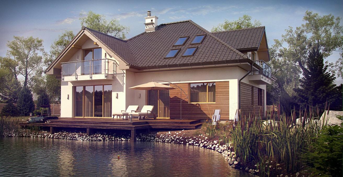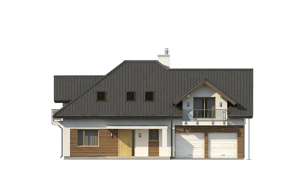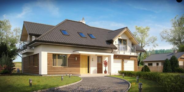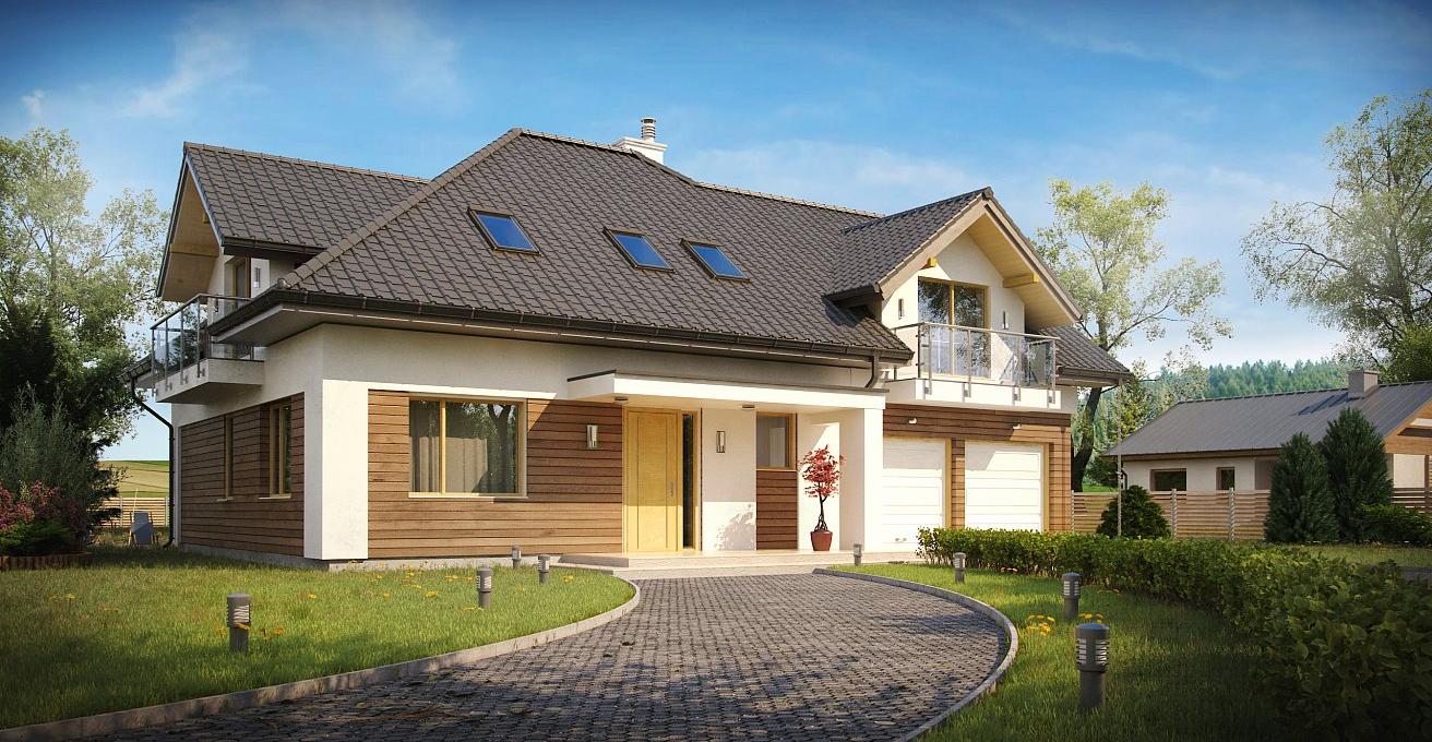 Классический проект дома с мансардой и гаражом на две машины.