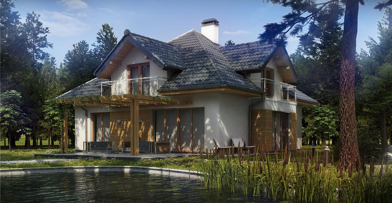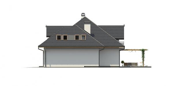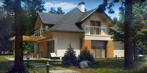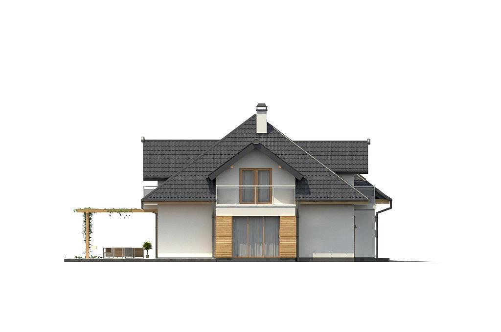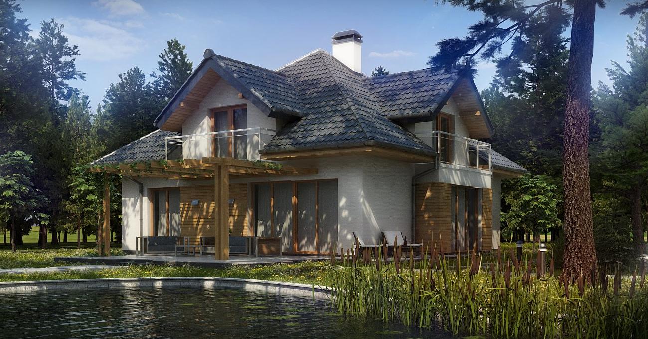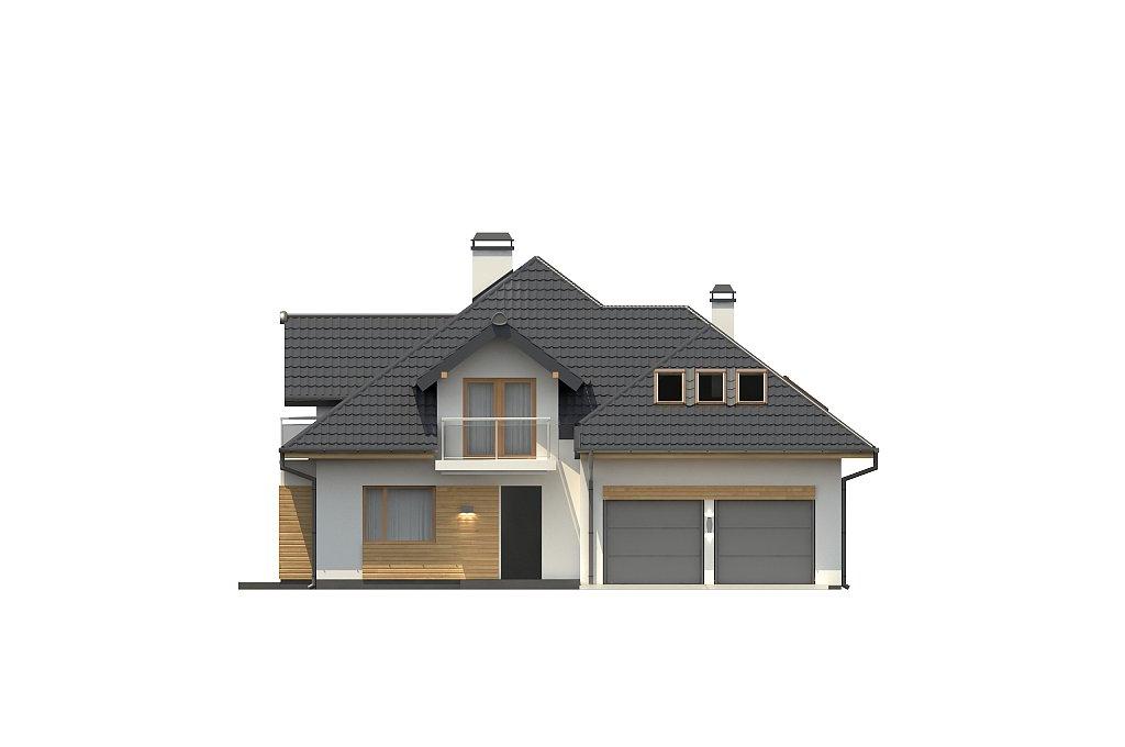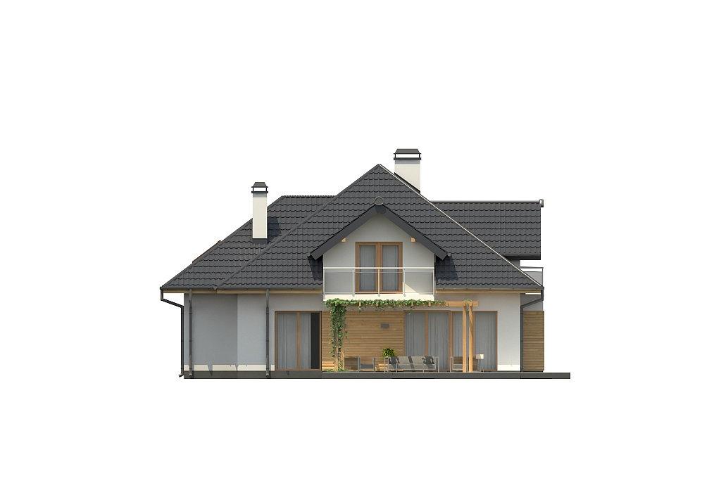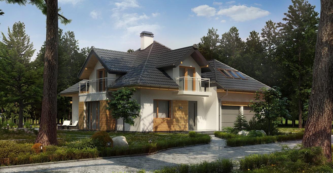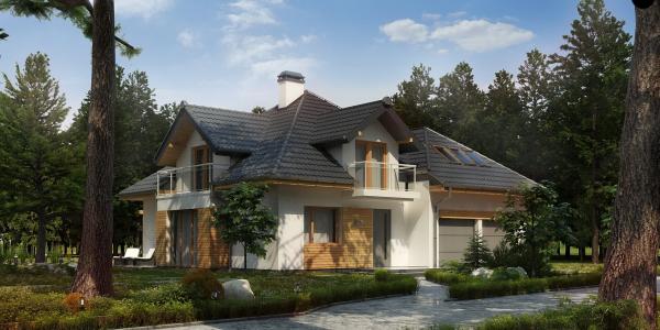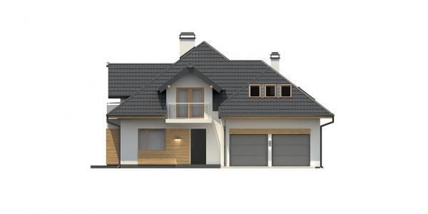 Разработка представляет версию проекта с альтернативной планировкой мансардного этажа. Именно мансарда является главным украшением экстерьера. В данном проекте вместо двух ванных комнат на втором уровне спроектирована одна общая. Кроме того, в новой разработке увеличено количество спален до четырёх, при этом у трёх комнат предусмотрены собственные балконы. Также несколько возросла площадь общего холла (теперь он занимает 9 кв.м). На первом этаже планировка оставлена прежней — здесь спроектирована дневная зона открытого типа. В дальней части выделено место для дополнительной комнаты.