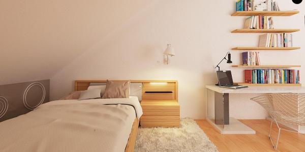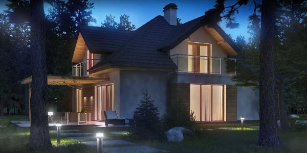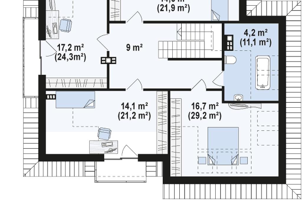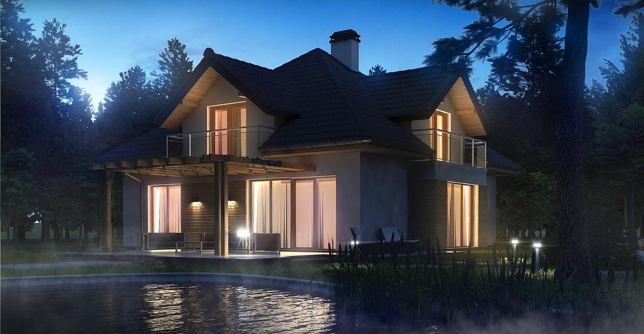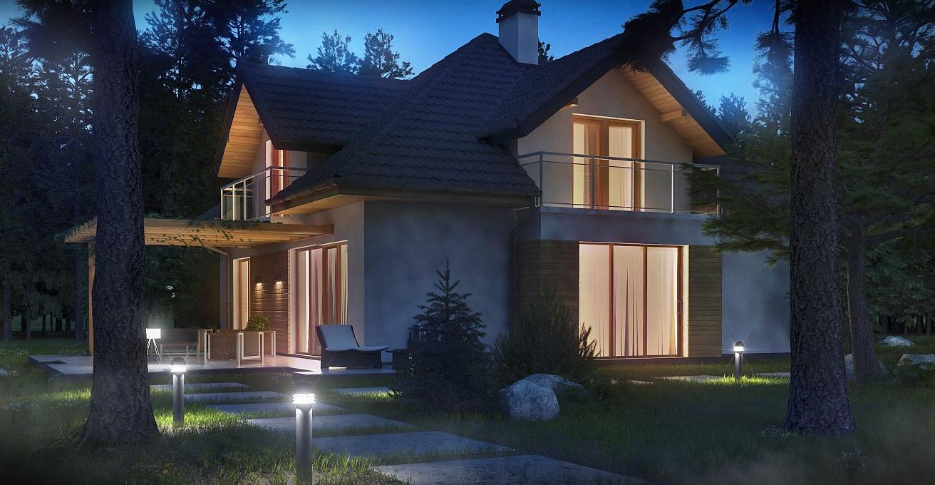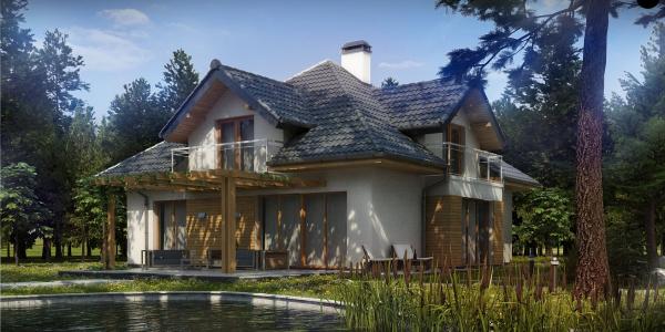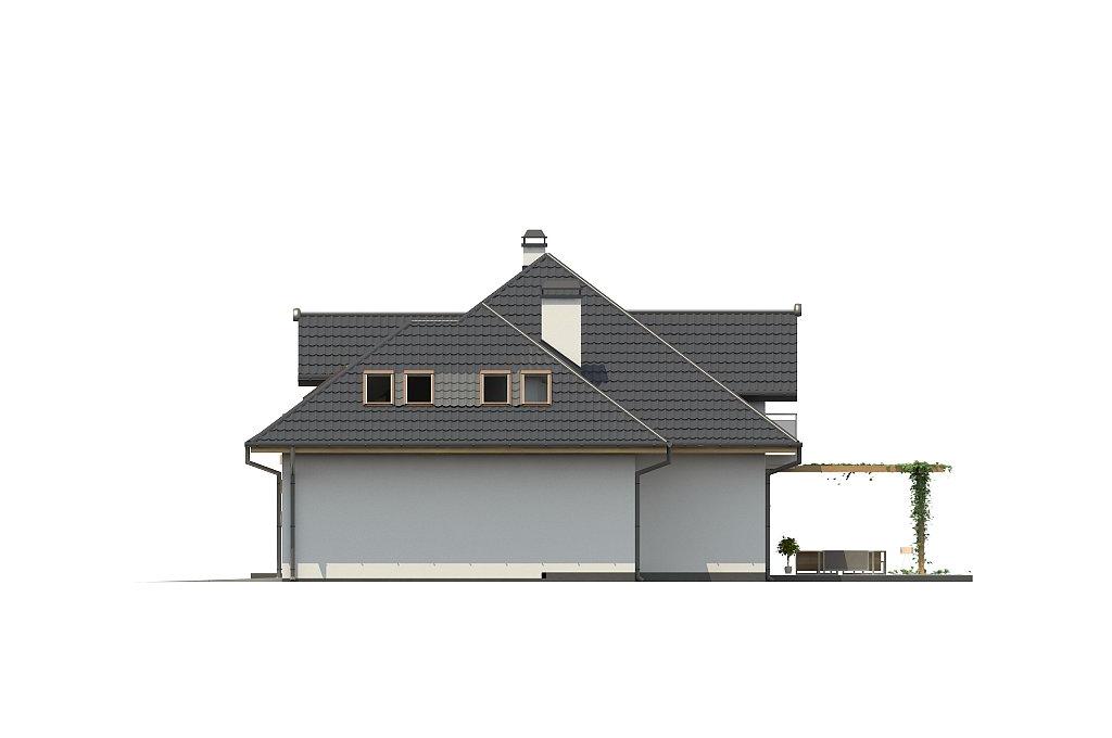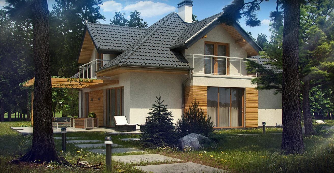 Разработка представляет версию проекта с альтернативной планировкой мансардного этажа. Именно мансарда является главным украшением экстерьера. В данном проекте вместо двух ванных комнат на втором уровне спроектирована одна общая. Кроме того, в новой разработке увеличено количество спален до четырёх, при этом у трёх комнат предусмотрены собственные балконы. Также несколько возросла площадь общего холла (теперь он занимает 9 кв.м). На первом этаже планировка оставлена прежней — здесь спроектирована дневная зона открытого типа. В дальней части выделено место для дополнительной комнаты.