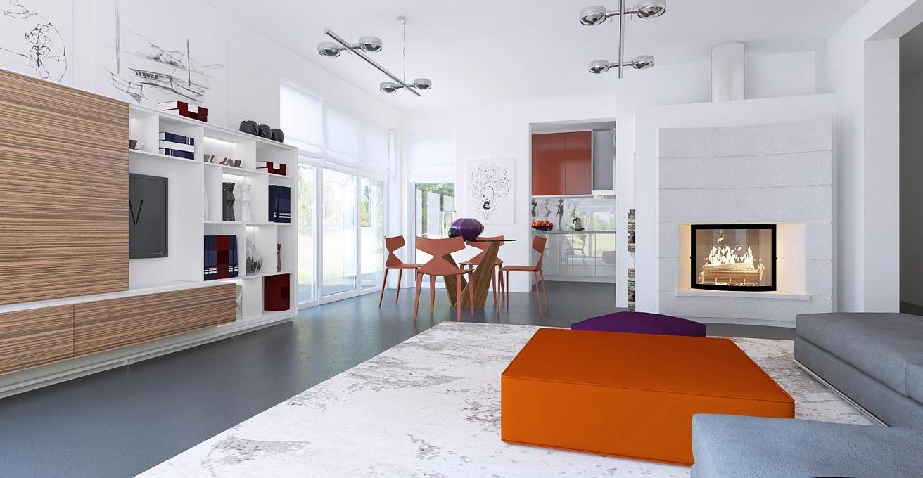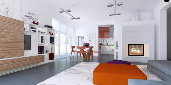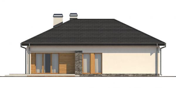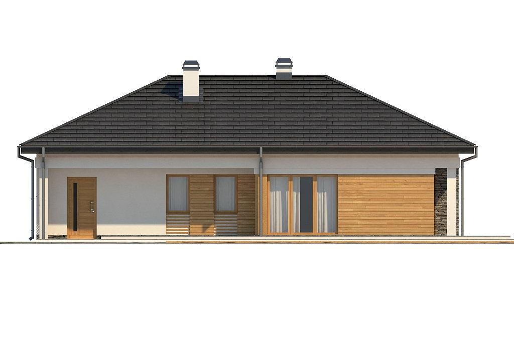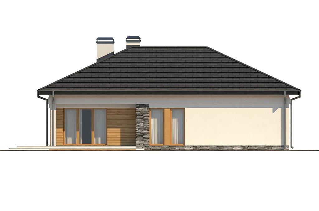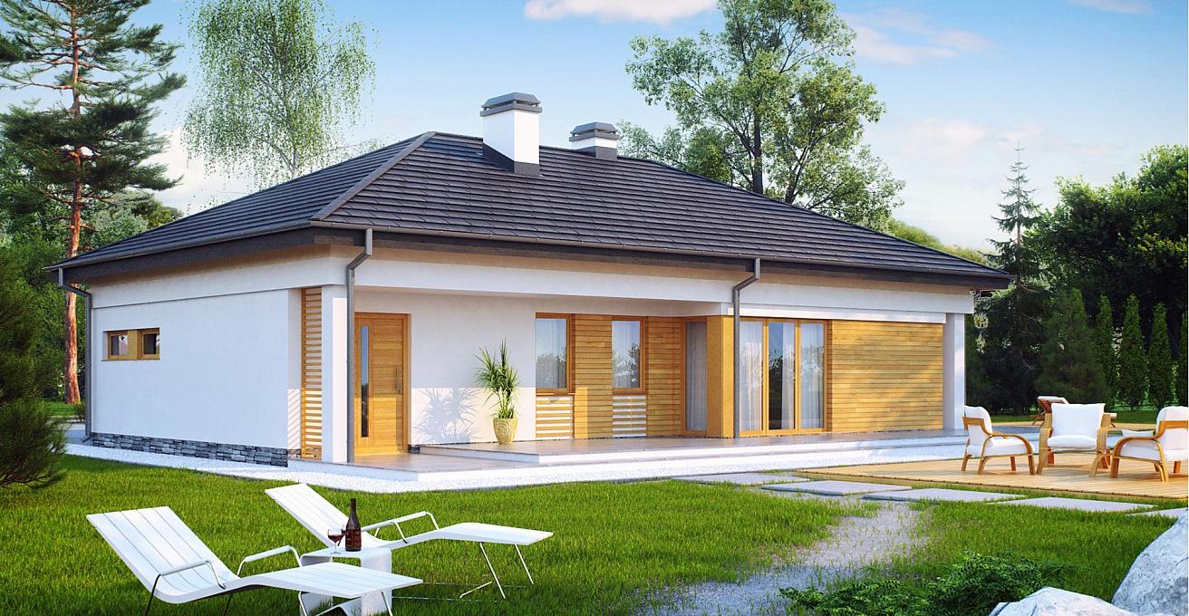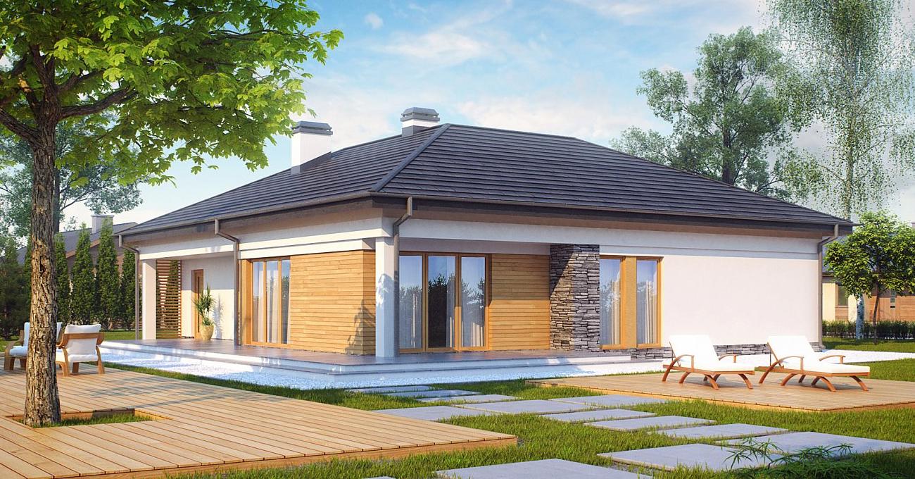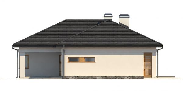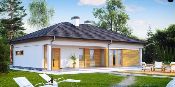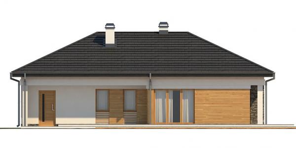 Это компактный, функциональный одноэтажный дом. Простую, аккуратную конструкцию разнообразит выступающее левое крыло, которое включает в себя, среди прочего две отдельные спальни. Облицовка фасада с дерева и камня придают дому современный вид. Дополнительным козыре является двухместной гараж и большое хозяйственное помещение с выходом в сад. Зоны дневная и ночная четко разделены, что обеспечивает домочадцам удобство и комфорт в использование. Дневная зона — это просторная гостиная с камином и выходом на террасу, который объединен со столовой и кухней. Продумано также место для небольшой кладовой на кухне. Ванная комната с душем дополняет дневную зону. В ночной части размещены 3 удобные спальни и большая ванная комната с окном. Спальня хозяев с большими балконными окнами оснащена дополнительно функциональным гардеробом. Мансарда, учитывая достаточно удобную высоту, может быть адаптирована под дополнительное помещение